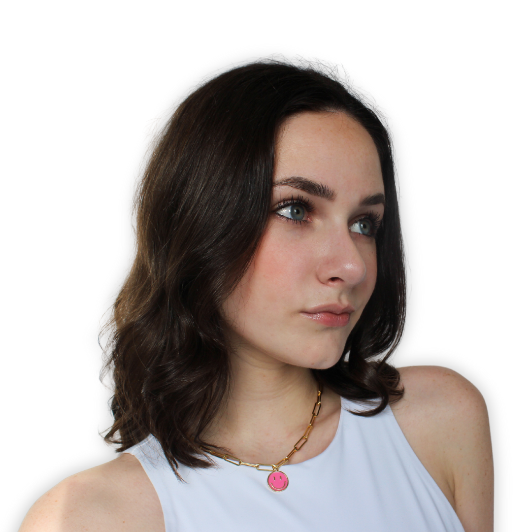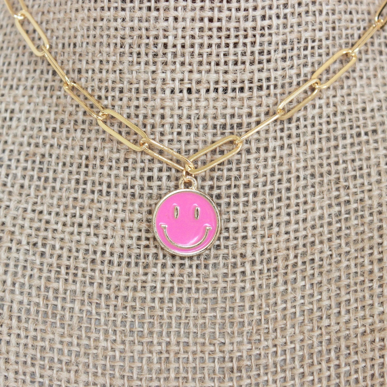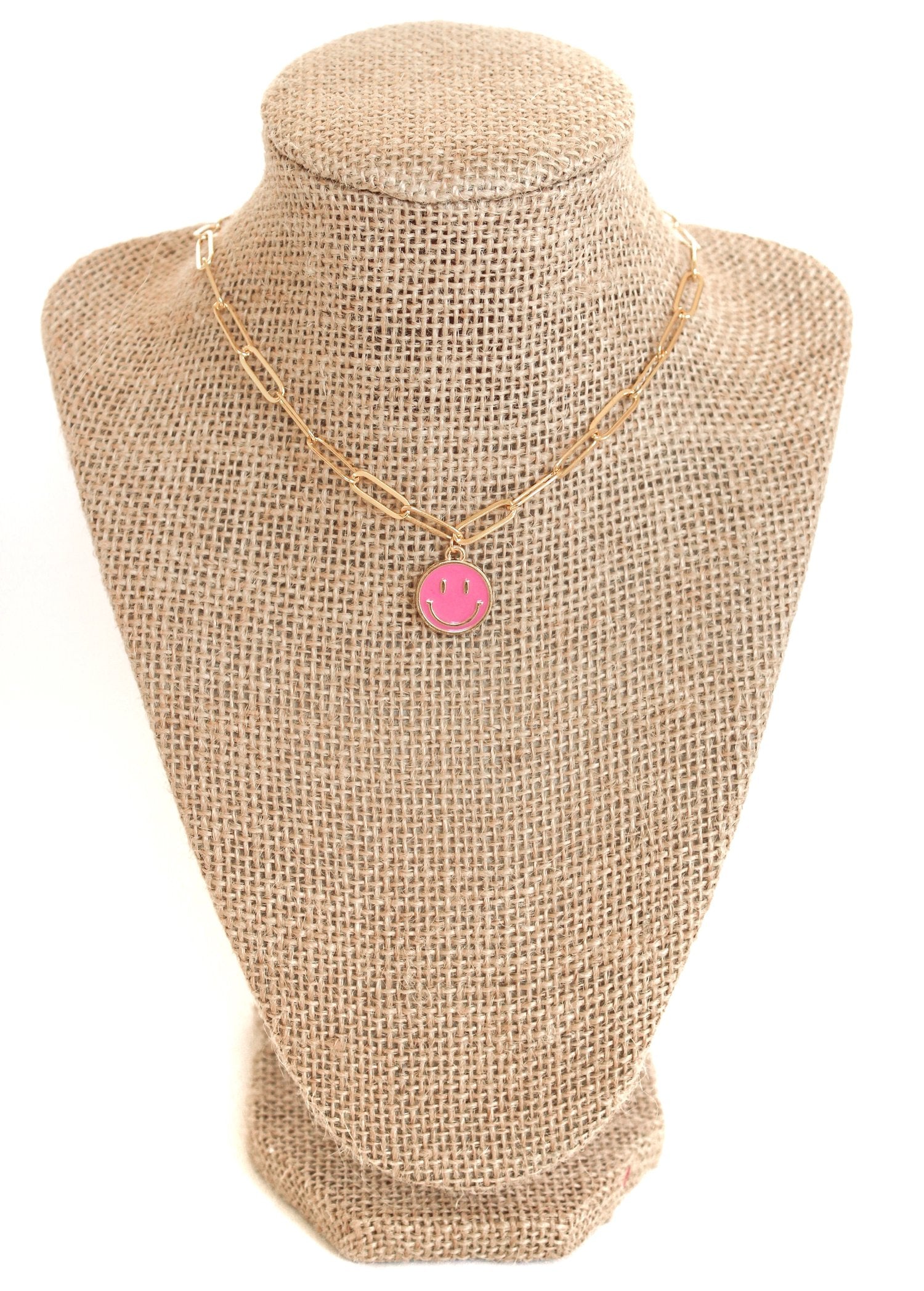 15 inch gold paperclip chain necklace with a 15 mm hot pink smiley face pendant. 2 inch extender.